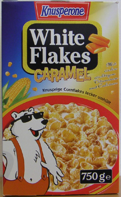 毎日同じフレークは飽きるので、複数のものを交代に食べてはどうか。そこでお勧めはKnusperoneのWhite Flakes CARAMEL。こちらはKnusperone製だけど大丈夫。普通のコーンフロストのキャラメル風味。牛乳でひたひたにして、その牛乳をすするのがまた格別。これはALDI Südでしか売ってないようで、しかもこのキャラメル味は数少ない。750g6箱入りの大箱が積んであるのだが、その6箱のうちキャラメル味は1箱しかないのだ。仕方なくスーパー内でまるで店員のように大箱を横に置く→キャラメル味だけ抜く→大箱を戻すという作業を強いられる。キャラメル味でなく、素のWhite Flakesと間違えやすいので注意。