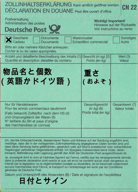 日本に小包を送るには、まず自分で適当な段ボール箱を入手するか、郵便局で買う。サイズは15x11x1cm以上120x60x60cm以下、20kg以下。円筒状のものは長さ15cm直径5cm以上、長さ120cm直径15cm以下。梱包し、箱に送り先と自分の住所氏名、航空便ならLuftpostなどと書く。小さくて軽い小包の場合は、郵便局でこんな緑色の小さな紙を渡されるので、英語かドイツ語で内容物と値段、サインを書いて、それを貼るだけ。大きい、重い小包の場合はこんな複写の用紙を渡されるので、左上のVonのところに自分の氏名・住所・電話番号、その下のAnのところに送り先の氏名・住所(とできれば電話番号)を書く。その下のBestimmungslandには送り先の国(ここではJapan)と書く。さらにその下、Detaillierte Beschreibung des Inhaltsには左から内容物、数量、重さ、値段(いずれもかなりテキトーでいい)を書く。さらに航空便の場合はその下のPOSTPACKET mit Luftpostにチェックする。その下のArt der Sendung(荷物の種類)は、普通はGeschenk(贈り物)にチェック。Warenmuster(商品見本)、Dokumente(書類)、Warenrücksendung(商品返送)、Sontiges(その他)というのもあるが、これで何か変わるのかは不明。あとはいちばん右下に日付とサインを書いて終わり。それを出すと職員が小包に貼ってくれるので、それが宛先となる。この場合は小包そのものに宛先を書く必要はない。最後は複写の控えをもらう。書き方はいずれも画像を参考にしてほしい、最低限これだけ書けば送れると思う。。